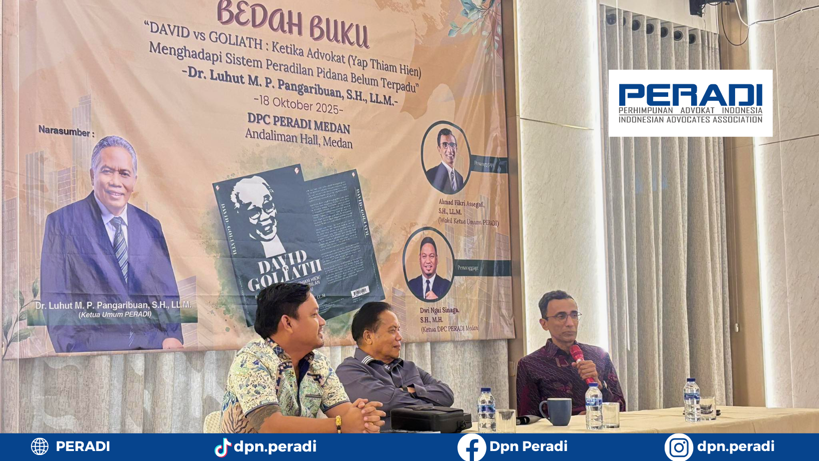 Perhimpunan Advokat Indonesia (PERADI) menyelenggarakan kegiatan Bedah Buku “David vs Goliath: Ketika Advokat (Yap Thiam Hien) Menghadapi Sistem Peradilan Pidana Belum Terpadu”, karya Dr. Luhut M.P. Pangaribuan, S.H., LL.M., yang juga menjabat sebagai Ketua Umum DPN PERADI.