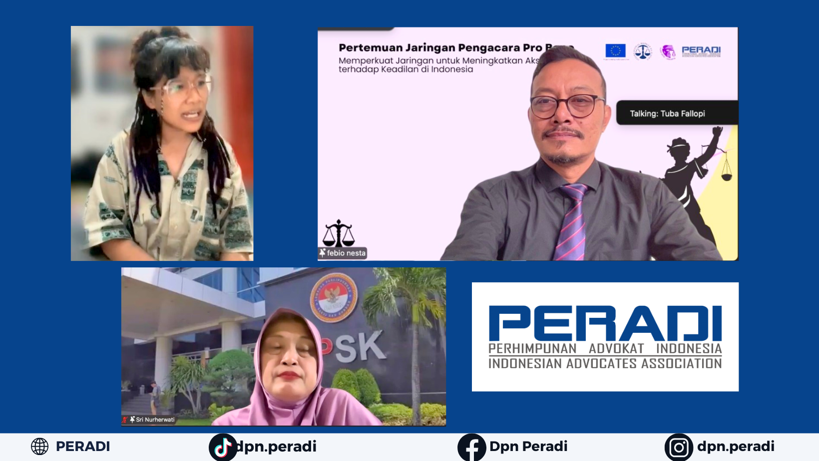 Ketua Bidang Pro Bono DPN PERADI, Febi Yonesta, S.H., menjadi salah satu pembicara dalam diskusi daring yang diselenggarakan oleh International Bridges to Justice (IBJ), LBH APIK Jakarta, dan PERADI. Forum ini dirancang sebagai wadah bagi advokat pro bono untuk berbagi pengalaman dan memperkuat kapasitas dalam pendampingan hukum yang berpihak pada korban.