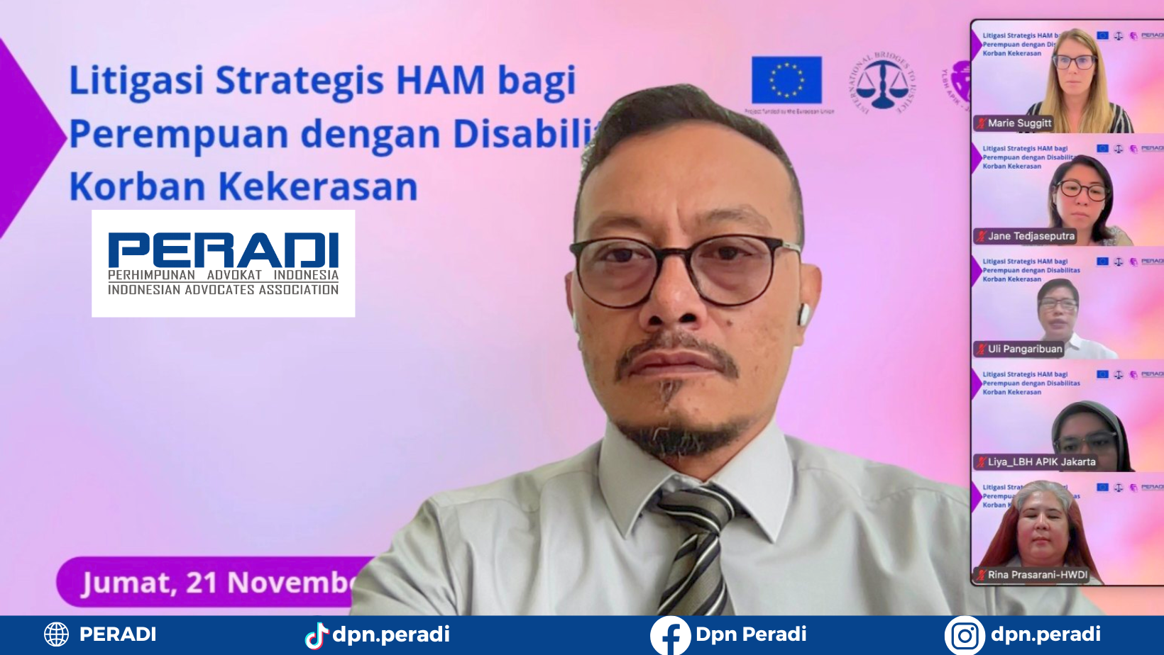 Dewan Pimpinan Nasional Perhimpunan Advokat Indonesia (DPN PERADI), bekerja sama dengan International Bridges to Justice (IBJ) dan LBH APIK Jakarta, kembali menyelenggarakan Pertemuan Jaringan Pro Bono secara daring pada Jumat, 21 November 2025. Forum ini menjadi ruang strategis bagi para advokat dan lembaga bantuan hukum untuk memperkuat pemahaman dan praktik litigasi strategis sebagai alat efektif dalam memperjuangkan hak asasi perempuan dengan disabilitas.